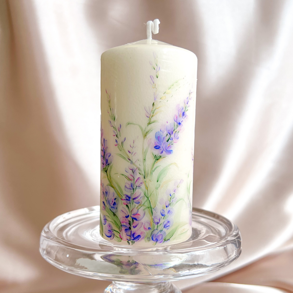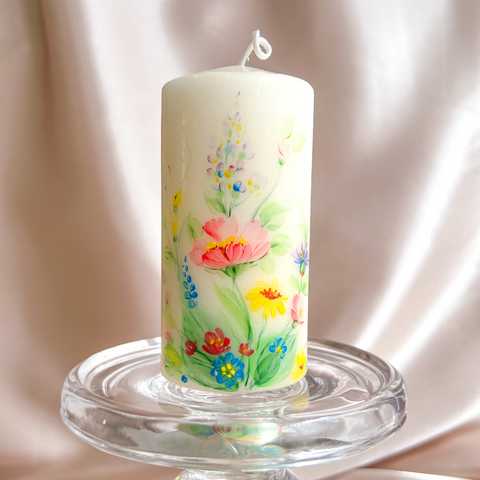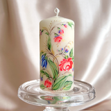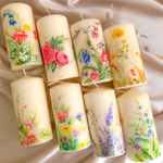Introducing our stunning hand-painted floral pillar candles, meticulously crafted to bring the beauty of nature into your home and beyond.