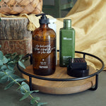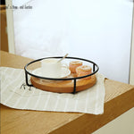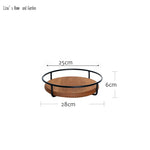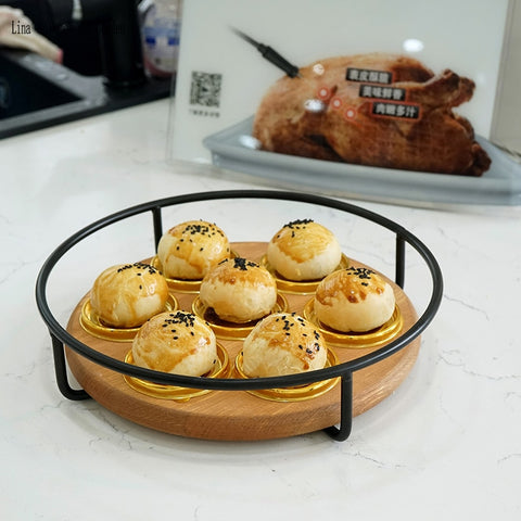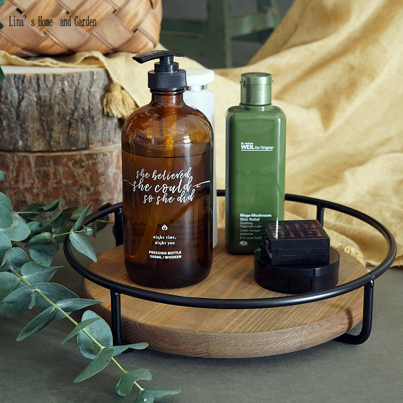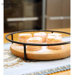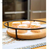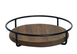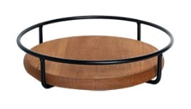 The round wooden tray has metal handles for easy carrying. You can also use it as a countertop décor item by leaning it against the wall.