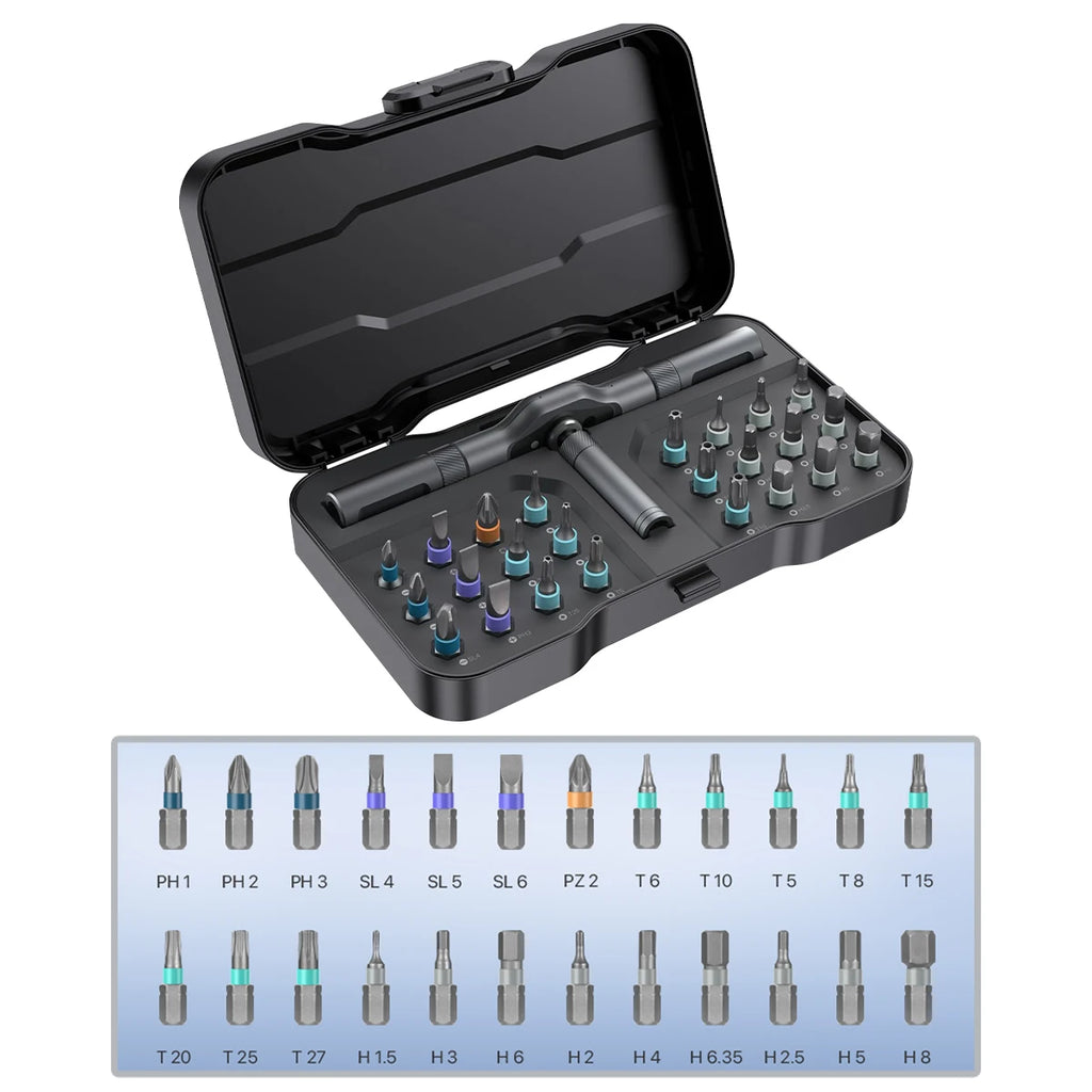 Get the job done with the 24-in-1 Ratchet Screwdriver Set. This powerful set includes 24 industrial-grade screwdriver bits and a high-performance ratchet wrench. Built for professional repair, DIY projects, home maintenance, and more, this tool offers reliable strength and flexibility. The entire kit weighs only 0.5 lb (0.23 kg) and includes compact components with maximum utility. Sized for convenience and built for heavy use.