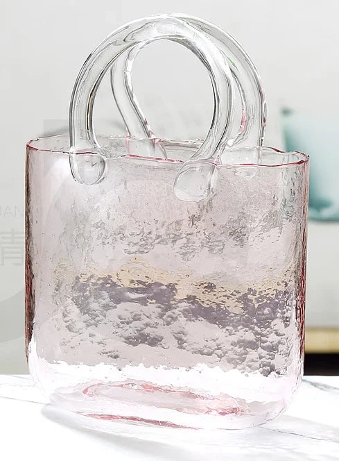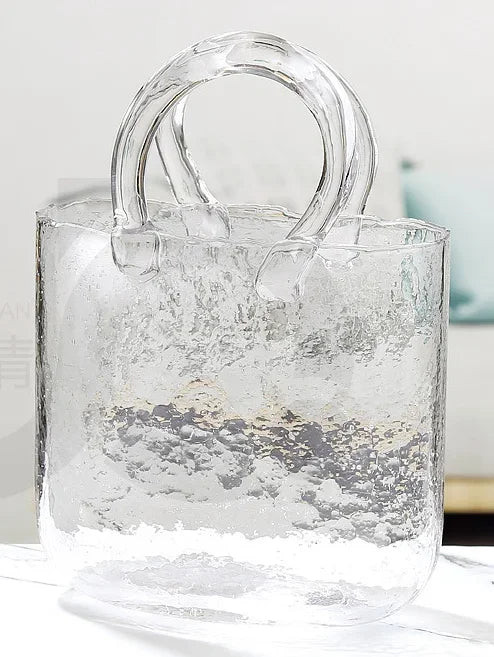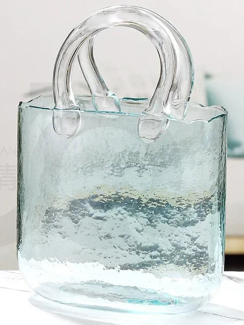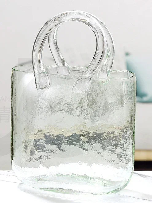 Bring a sense of whimsy to your home with this Nordic-style handbag glass vase. Its hand-blown design, featuring small air bubbles and a handbag shape, makes it a unique decorative piece for any space. The glass handbag vase is crafted with a thickened bottom for stability and two strong handles. It’s ideal for holding flowers or as a standalone display. This glass vase handbag is perfect for gifting or for enhancing the style of your dining table, windowsill, or office.