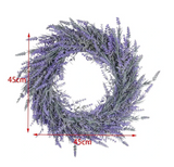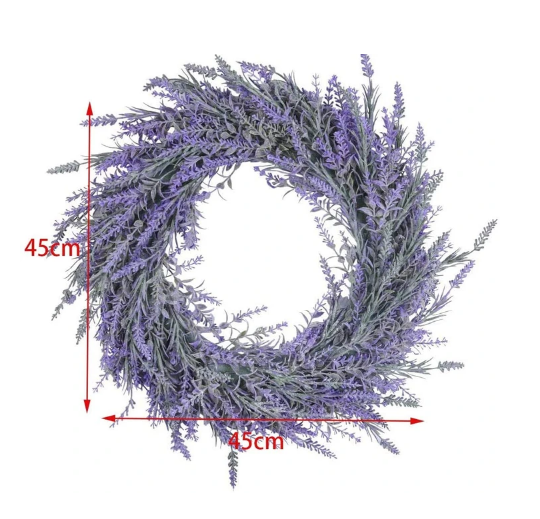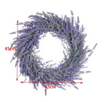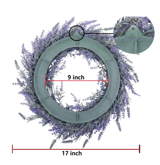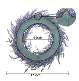 Lavender Wreath is a very ideal home and office decoration that measures approx. 17" external diameter and 3" in depth. Plastic wreath base, 9 inch inner diameter, comes with a hole on the base for easy hanging.
