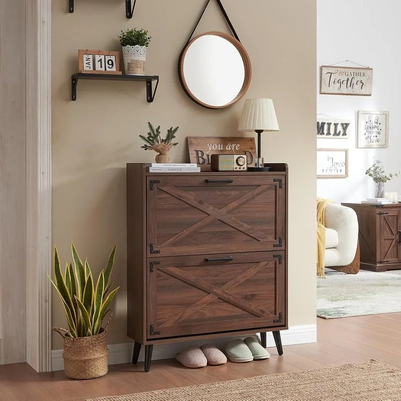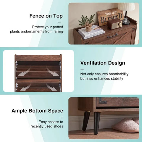 Say goodbye to cluttered entryways with this slim shoe cabinet. This narrow shoe cabinet fits in tight spaces while keeping your shoes neatly stored. The flip-drawer shoe cabinet design provides hidden shoe storage, giving your home a tidy and modern look. This freestanding shoe cabinet is ideal for hallway shoe storage, entryways, and foyers, offering a space-saving shoe rack solution with a wooden shoe rack finish.