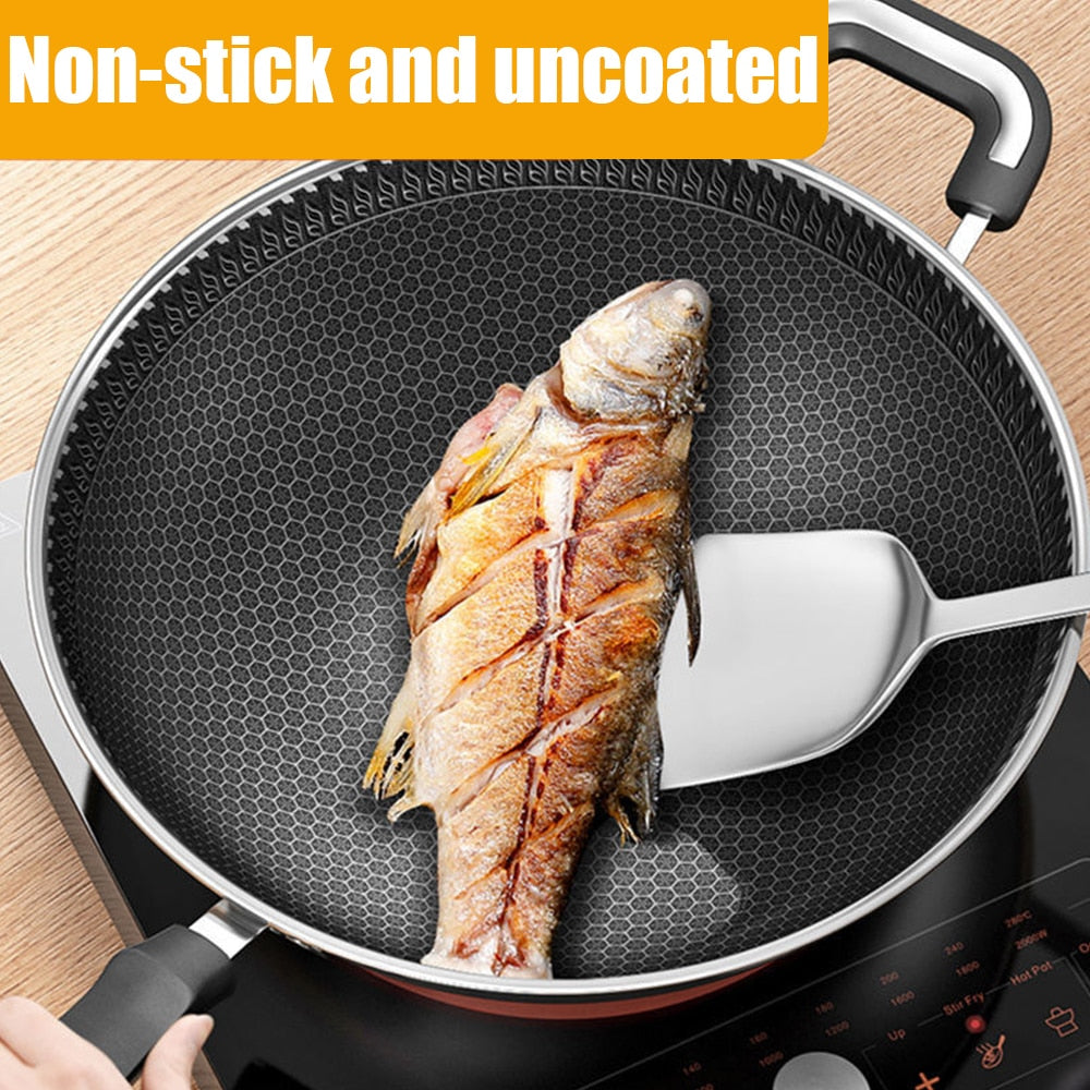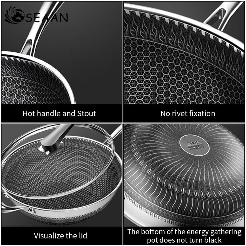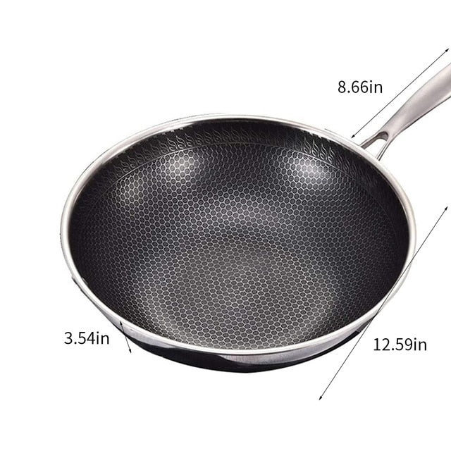 - ABRASION RESISTANCE: This frying pan is not afraid of scratching or picking a spatula. The inside and outside are made of 304 stainless steel. The suspension layer is integrated with the pot body through a die-casting process. It has high strength, wear resistance and no fear of scratching.