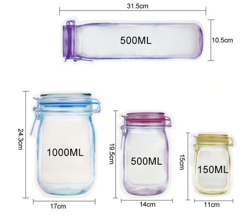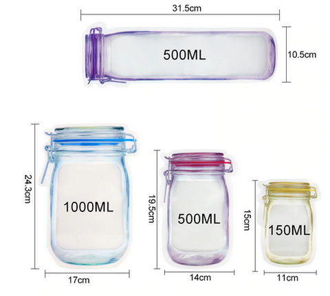 Reusable mason jar zip-closed storage bag. Clever design allows bags to stand when filled.Zipper lock ideal to protect the freshness of the food.Lightweight and easy to storage