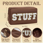 These soft fuzzy cosmetic pouches with 3D text are perfect for daily storage and travel. Designed from waterproof nylon, they are odorless, reliable, and easy to clean. The interior is lined with thick sponge padding to protect your cosmetics and personal items. Each bag features bold glitter chenille letters, giving you both style and function. With four roomy bags, you’ll stay organized whether at home or on the go.