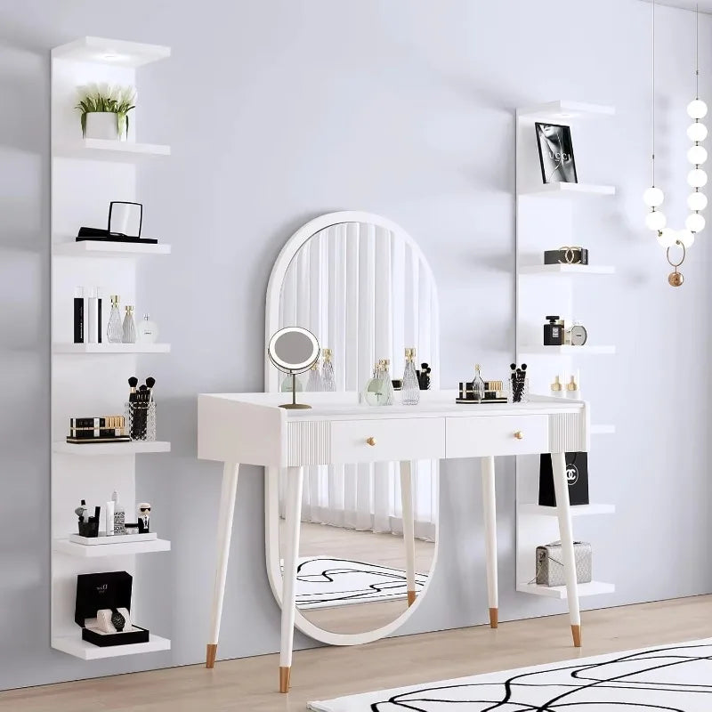 Wall-Mounted Shelf with Lighting: This modern shelf combines a floating design with built-in LED lighting. It offers an elegant way to display items while providing a soft, ambient glow that elevates the look of your room without taking up floor space.